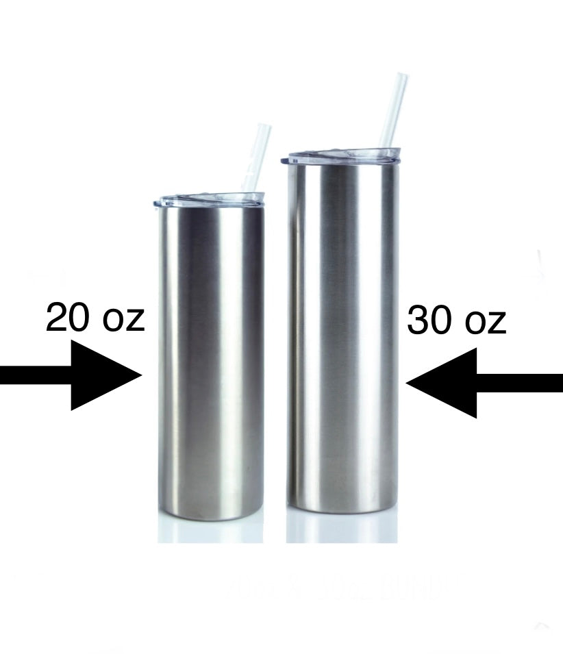 We currently have 20 and 30 ounce skinny tumblers, as pictured here. The tumblers do not have handles, but upon request we can get it. All other sizes, ask us in advance.